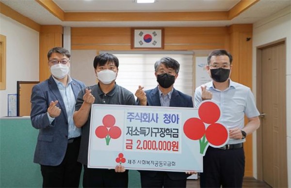 ㈜청아(대표 정민호)는 지난 27일 연동주민센터에서 제주사회복지공동모금회(회장 강지언)를 통해 저소득 가정 학생들의 장학금으로 써달라며 200만원을 기탁했다.