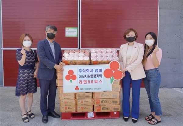 ㈜청아(대표 정민호)는 지난 6일 제주도사회복지협의회(회장 고승화)에서 지역사회 어려운 이웃을 위해 사용해 달라며 라면 80상자를 제주사회복지공동모금회(회장 강지언)를 통해 기탁했다.