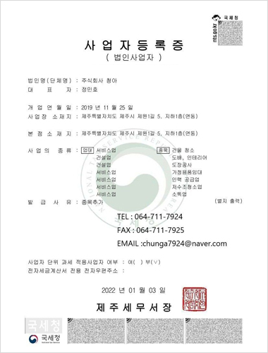 상호명. 주식회사 청아 주소. 제주특별자치도 제주시 제원1길 5 (우)63129 대표자. 정민호